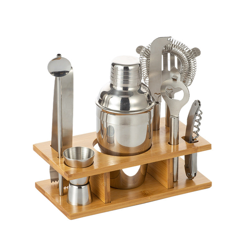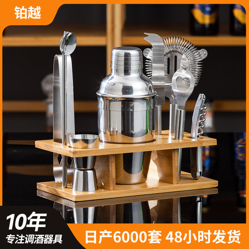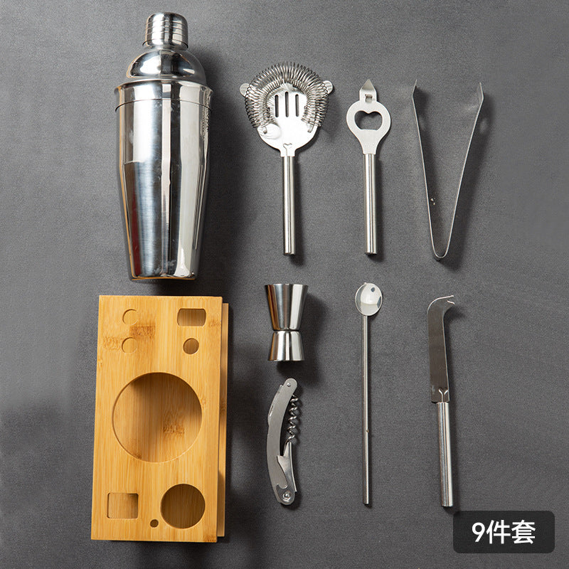Amazon direct supply stainless steel bartending set wooden base bar tool cocktail set 9-piece bartending set